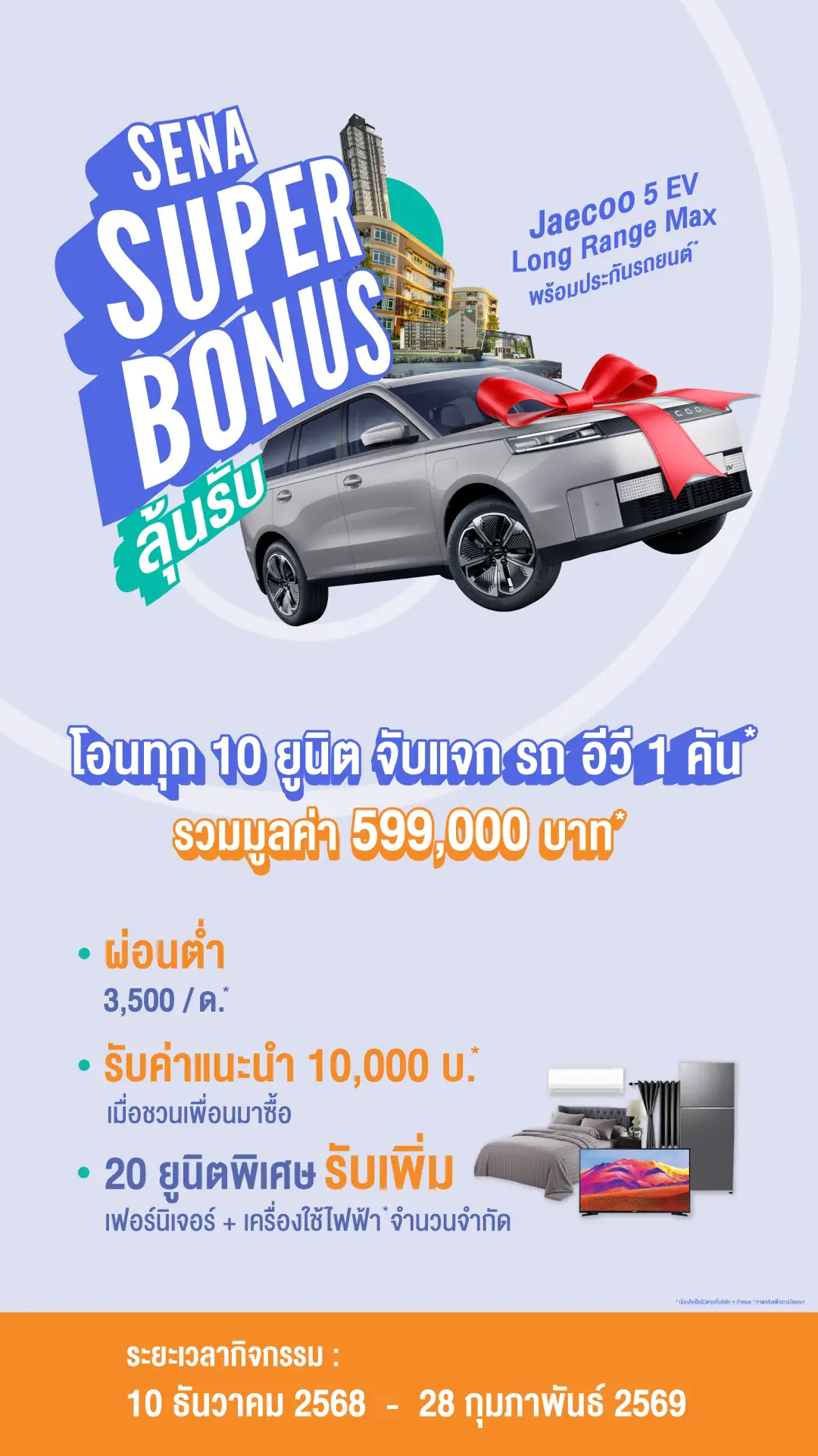 1. ระยะเวลากิจกรรม วันที่ 10 ธันวาคม 2568 ถึงวันที่ 28 กุมภาพันธ์ 2569 (81 วัน) ซื้อคอนโด แจกรถ EV โอนทุก 10 ยูนิต ลุ้นรับ Jaecoo EV5* จำนวน 1 คัน ราคา 599,000 บาท พร้อมประกันรถยนต์ชั้น 1 มูลค่า 23,200 บาท รวมมูลค่ารางวัลละ 622,2000 บาท