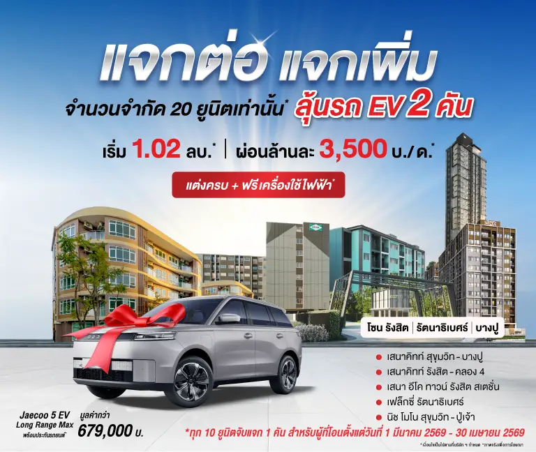 ซื้อคอนโด แจกรถ EV โอนทุก 10 ยูนิต ลุ้นรับ Jaecoo EV5* จำนวน 1 คัน ราคา 679,000 บาท พร้อมประกันรถยนต์ชั้น 1 มูลค่า 23,200 บาท รวมมูลค่ารางวัลละ 702,200 บาท