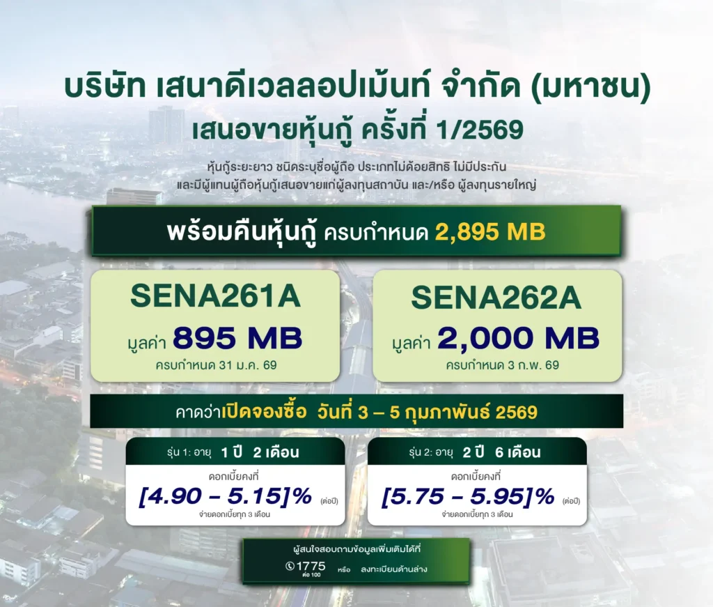 บริษัท เสนาดีเวลลอปเม้นท์ จำกัด (มหาชน) เตรียมเสนอขายหุ้นกู้ ครั้งที่ 1/2569